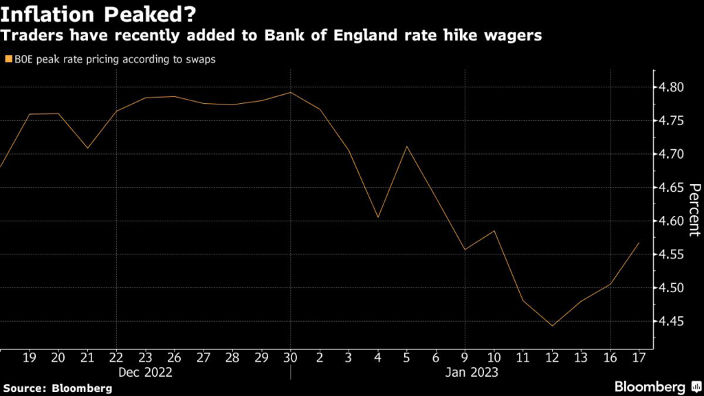 While UK policy makers slowed their pace of tightening to 50 basis points last month, Governor Andrew Bailey warned that risks to the outlook for inflation remain tilted to the upside.