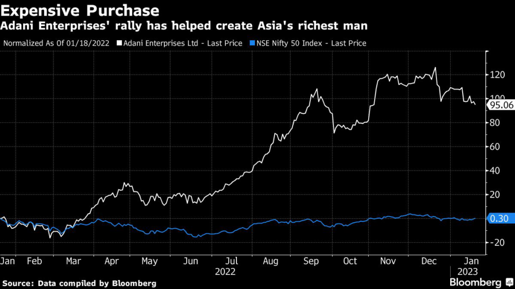 Adani Enterprises’ shares have surged 95% over the past year to 3,596.7 rupees.