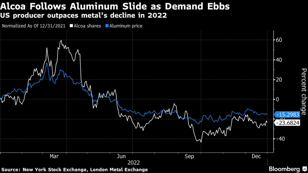 (Bloomberg) — Alcoa Corp.’s aluminum shipments will be weaker than anticipated this year amid ongoing uncertainties caused by global inflation, dwindling demand in Europe and a soft economic outlook in China, the world’s biggest consumer.
