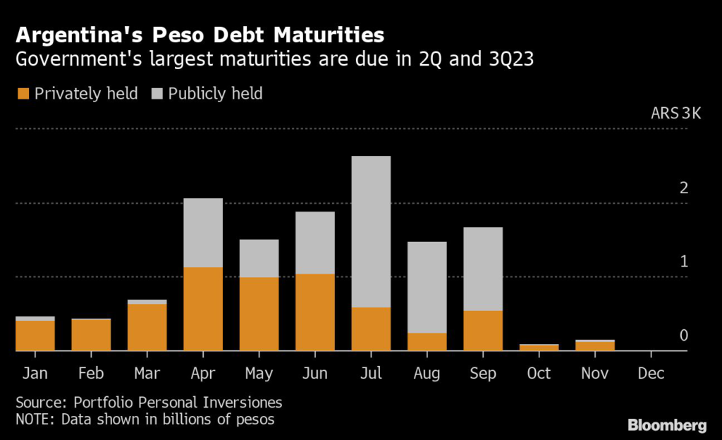 The Treasury is seeking to refinance around 365 billion pesos ($2 billion) in local notes and bonds, with about 86% of the total maturities held by the private sector, according to Portfolio Personal Inversiones.
