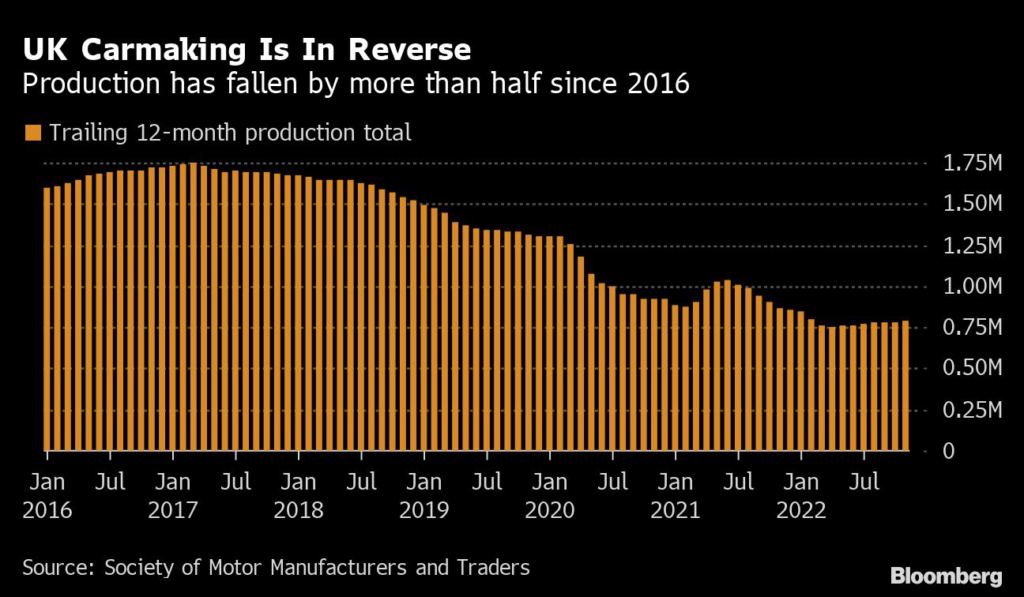 Within days of Sunak becoming Prime Minister in October, the auto industry’s trade group called on the government to improve the UK’s business environment while reporting another monthly contraction in production.