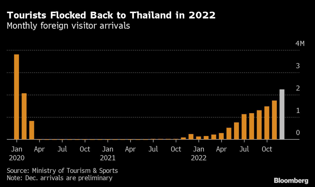 (Bloomberg) — An upswing in tourism from China’s reopening will help boost Thailand’s economy, but isn’t sufficient to restore growth to pre-pandemic levels just yet, according to analysts.