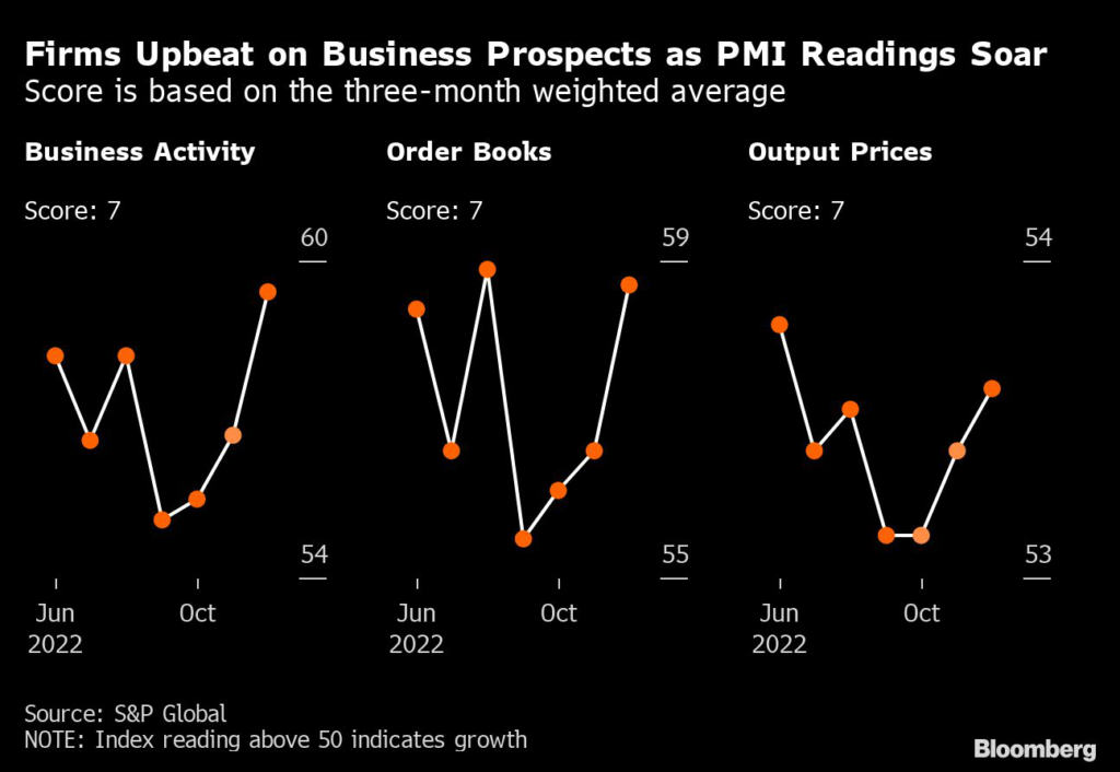 (Bloomberg) — India’s economy picked up speed in December as business conditions improved, marking a rebound for the South Asian nation that had showed signs of a slowdown the preceding month.