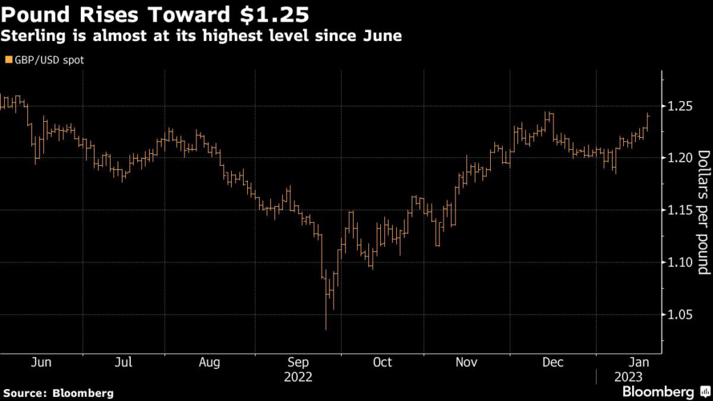 (Bloomberg) — The pound surged after a spate of weak US economic data spurred speculation inflation is peaking and policy makers across the world are nearing the end of their hiking cycles.