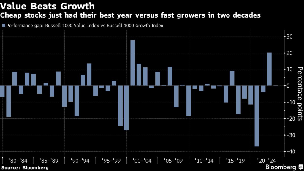 Consider the performance of value stocks, a style dominated by economically sensitive companies like energy and banks. After trailing their tech-heavy growth counterparts for five straight years, cheap shares are finally having their moment to shine.