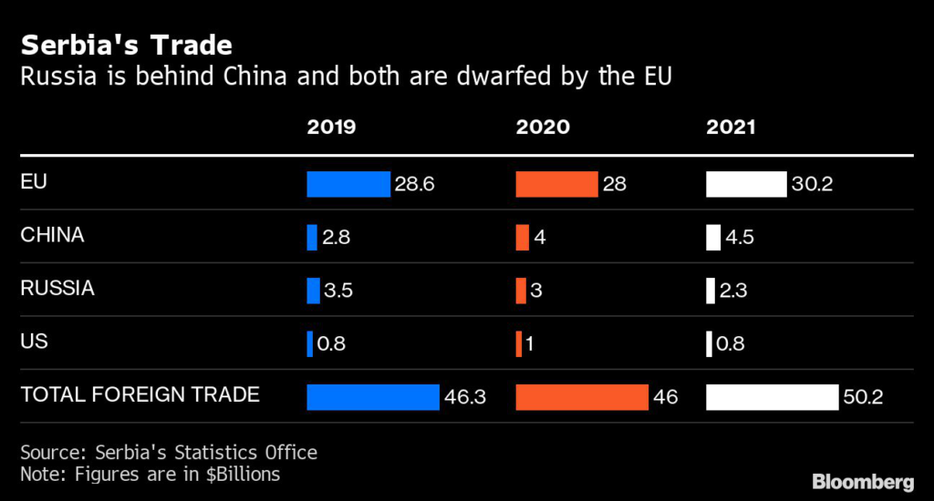 The country accounts for about 6% of Serbia’s foreign trade. The EU is by far the biggest partner. To steady finances late last year, Serbia secured €2.4 billion ($2.6 billion) funding from the International Monetary Fund and a $1 billion loan from United Arab Emirates, which has been deepening ties with the Balkan country.