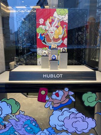Clothing and backdrops featuring meadow and rabbit motifs have appeared in the windows of stores such as Salvatore Ferragamo, Loewe and watchmaker Hublot on and around the elegant street as China prepares to usher in the Year of the Rabbit.