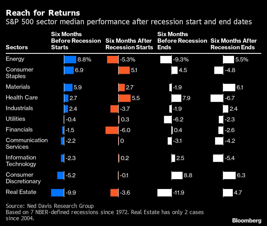 Those that tend to peak late in economic cycles, like materials producers and industrial companies, usually perform strongly in the six months ahead of a recession. The same goes for consumer-staples and health-care stocks.