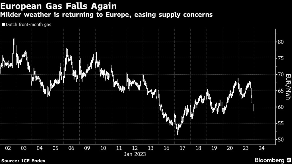 (Bloomberg) — European natural gas dropped with fuller-than-normal stockpiles protecting against any supply curbs, while the demand outlook eased with an icy blast forecast to end soon.
