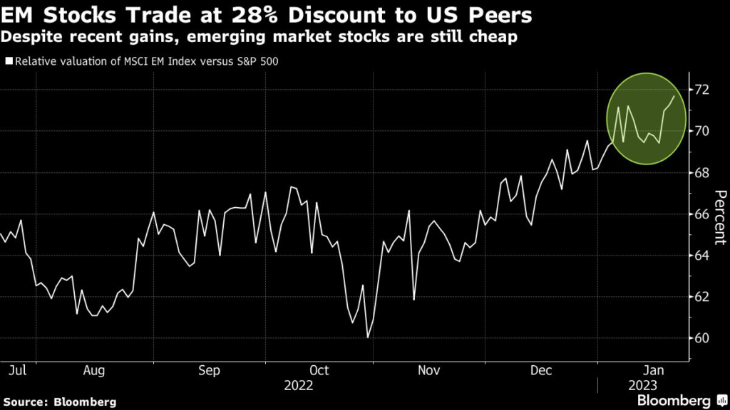 The gains come as China’s pullback from its strict Covid Zero policy brightens the economic outlook, while investors position for the end of aggressive central bank interest-rate hikes. Many also still see US stocks as expensive, with those in emerging-markets trading at a nearly 30% discount.