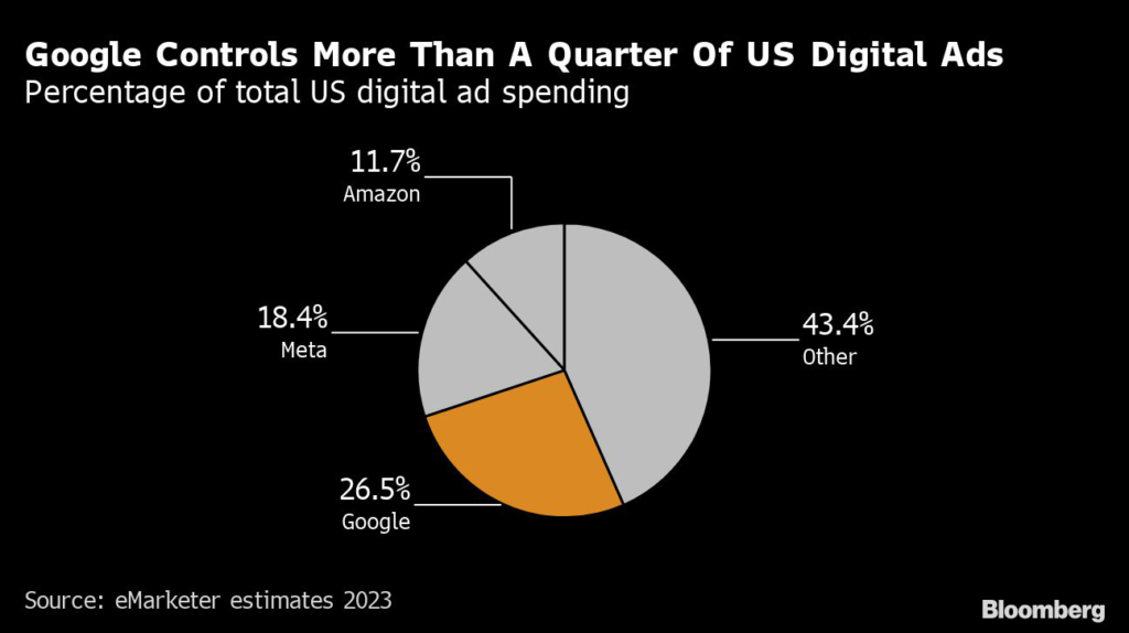 The Mountain View, California-based company is No. 1 in the $626.9 billion global digital ad market, according to 2023 estimates by research firm EMarketer, with the US representing the biggest piece.