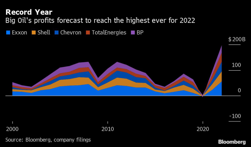The five companies are expected to report $198.7 billion in combined 2022 profit in coming days, 50% higher than the previous annual record set more than a decade ago, according to data compiled by Bloomberg.