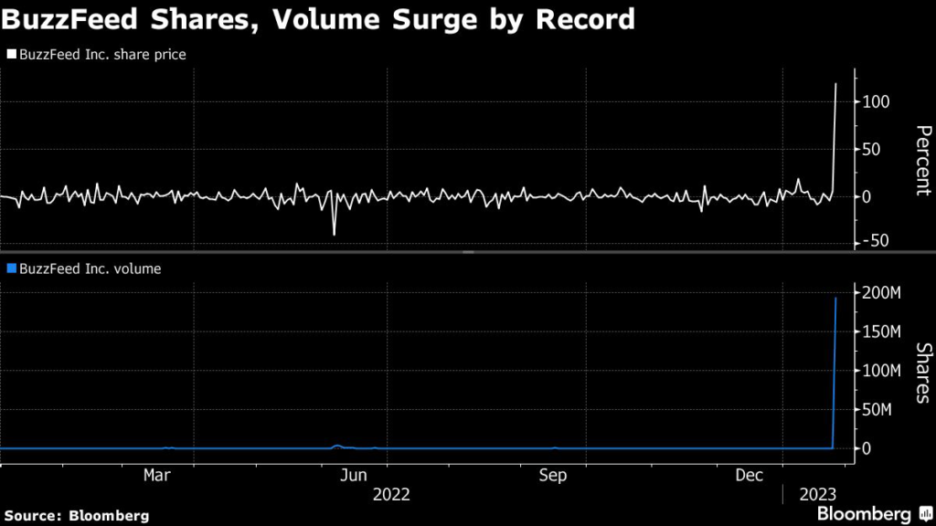 The stock rose by 120% Thursday, bringing BuzzFeed’s market value to nearly $300 million, in its biggest gain since going public via a blank-check merger in December 2021.