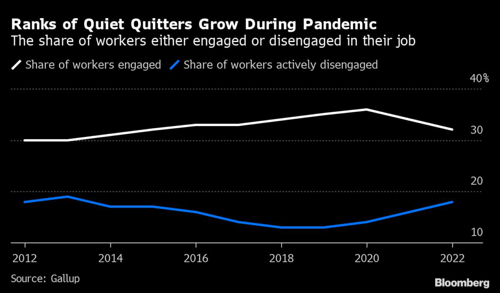 (Bloomberg) — Close to one in five workers has fully checked out on the job, and employees’ sense that they’re being treated fairly has plummeted, according to two new surveys that paint a dismal picture of the American workplace.