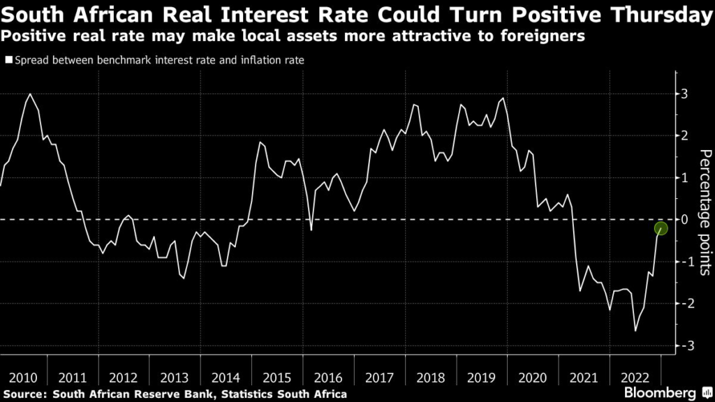 (Bloomberg) — South Africa’s central bank is set to moderate its most aggressive interest-rate hiking cycle in at least two decades Thursday, and economists and traders will be on high alert for any signs of a pivot away from policy tightening.