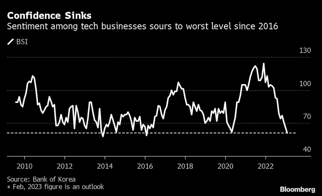 (Bloomberg) — South Korea’s tech industry is now more pessimistic about consumer demand than it was during the pandemic, with the outlook for confidence seen slipping to its lowest level in seven years.