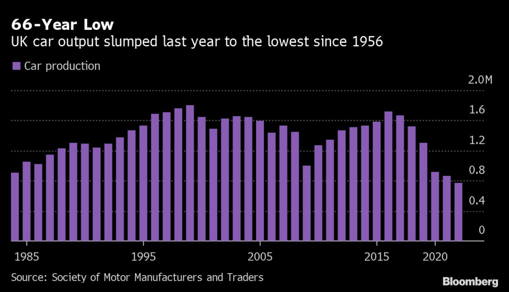 (Bloomberg) — Automakers had their worst year in the UK in more than six decades after the global semiconductor shortage and the closing of key factories hammered output.