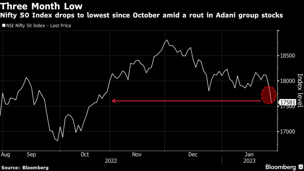 A $50 billion selloff in Adani Group’s empire following US short seller Hindenburg Research’s scathing allegations has dragged the NSE Nifty 50 Index to its lowest since Oct.