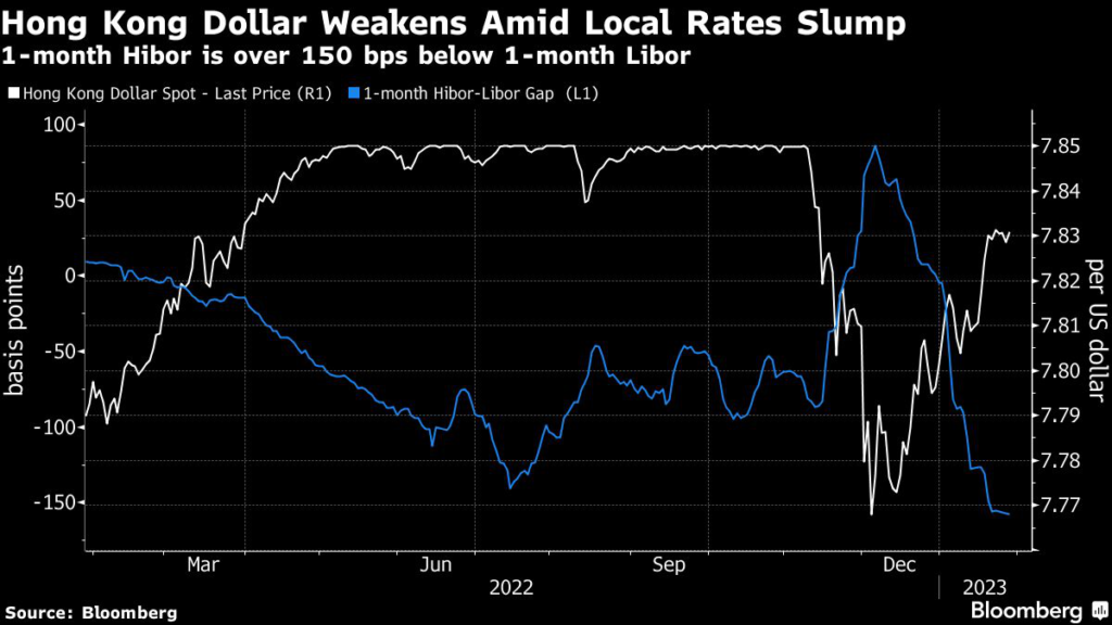 That’s because the city’s one-month interbank borrowing rate slid, widening its gap with the US equivalent by the most since 2008. The large spread makes it lucrative for traders to borrow Hong Kong’s currency cheaply and sell it against the higher-yielding greenback.