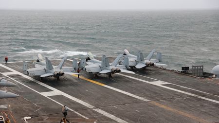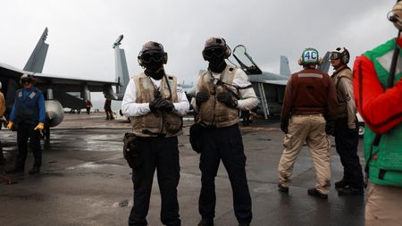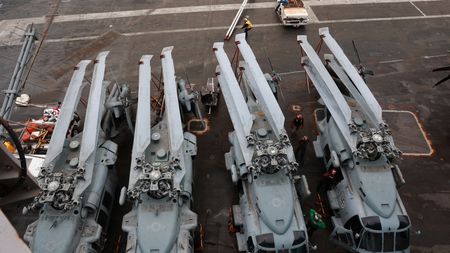 ABOARD THE NIMITZ, South China Sea (Reuters) – Over a few hours under grey skies, dozens of combat planes and helicopters roar on and off the flight deck of the aircraft carrier Nimitz, in a demonstration of U.S.