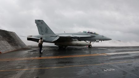MH-60 Seahawk helicopters and F/A-18 Hornet jets bearing pilot call signs like “Fozzie Bear”, “Pig Sweat” and “Bongoo” emit deafening screams as they land in the drizzle on the Nimitz, which is leading a carrier strike group that entered the South China Sea two weeks ago.