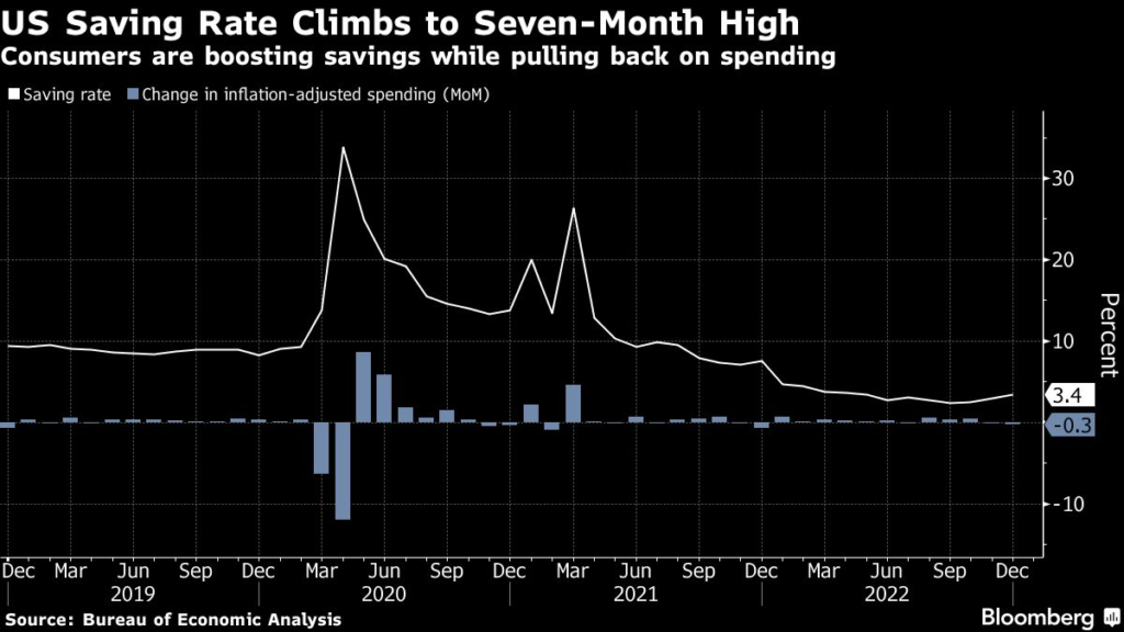 The saving rate rose for a third month to 3.4% in December, the highest level in seven months, according to Commerce Department data out Friday.