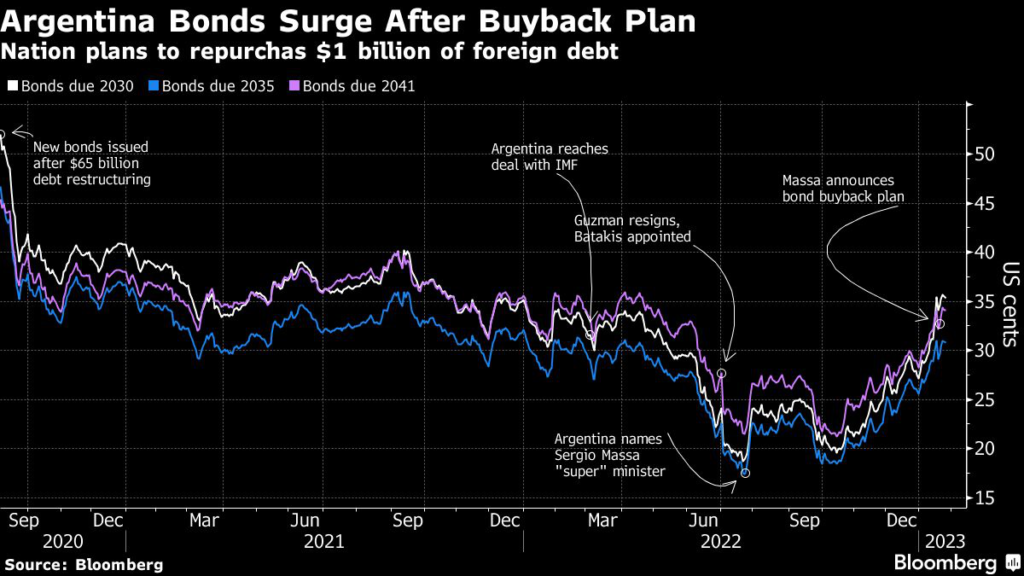Argentina’s Economy Ministry is using dollars held by the Treasury to fund direct repurchases the securities at the market rate, and plans to offset the cost of the purchases from money it expects to save from energy imports it presumes it won’t need in 2023.