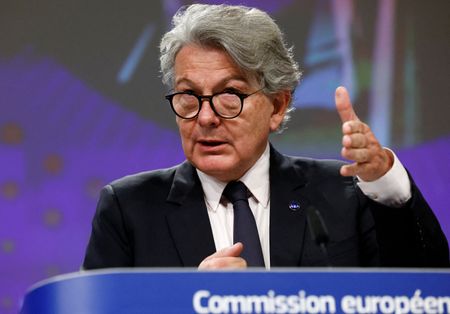 WASHINGTON (Reuters) – The European Union wants a deal quickly with the United States to resolve a dispute over U.S. electric vehicle tax credits, but the EU must pursue its own green technology subsidies to keep investment at home, EU Internal Market Commissioner Thierry Breton said on Friday.