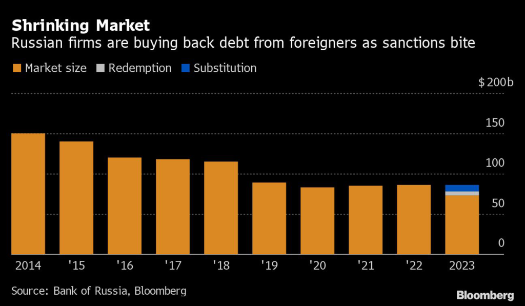 The actions have shrunk Russia’s international bond market, worth $85.6 billion before the invasion, by about $12.7 billion.