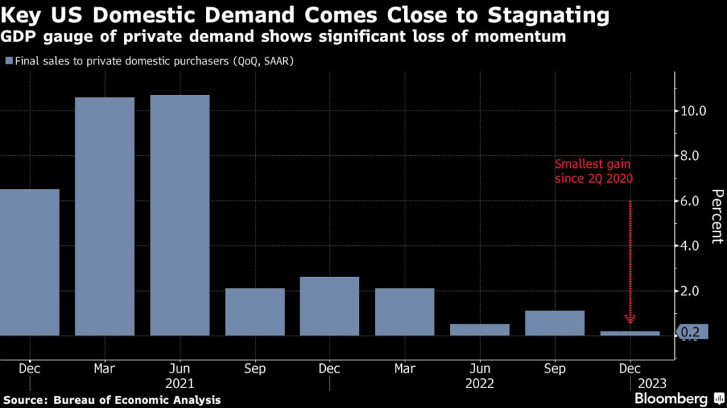 Inflation-adjusted final sales to private domestic purchasers, which strip out inventories and net exports while excluding government spending, rose at a paltry 0.2% rate — also the weakest since the second quarter of 2020.