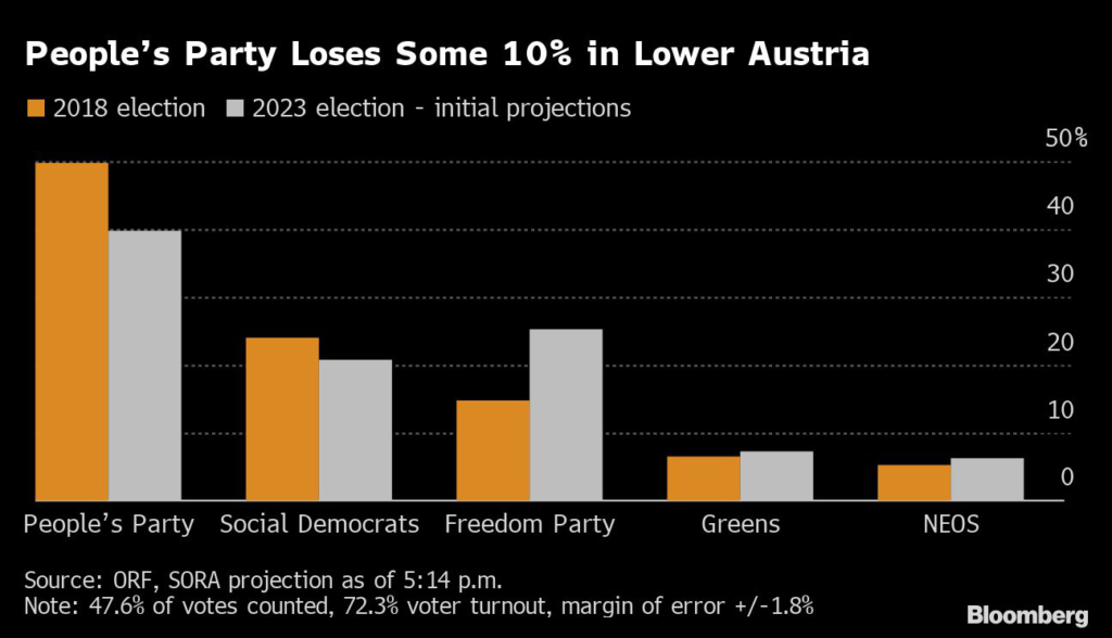 (Bloomberg) — The senior party in Austria’s ruling coalition lost votes to right-wing nationalists in a key provincial election, signaling that support for Chancellor Karl Nehammer’s government may be fading.