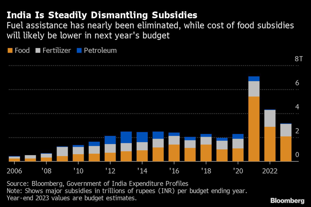 India recently restructured the world’s biggest food program and trimmed energy subsidies to enable about 1 trillion rupees ($12.3 billion) in government savings.