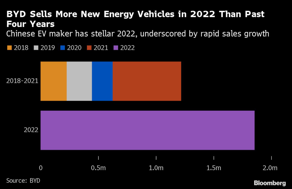 BYD sold 1.86 million new EV’s in 2022, more than the previous four years combined. The company avoided some of the supply-chain and Covid disruptions that hurt its rivals, thanks to its ability to produce key components including batteries and semiconductors.
