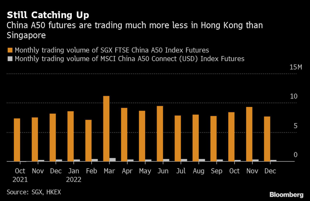 Another breakthrough happened last year when MSCI launched its A50 futures on Hong Kong Exchanges & Clearing Ltd., competing with Chinese stock futures trading in Singapore.