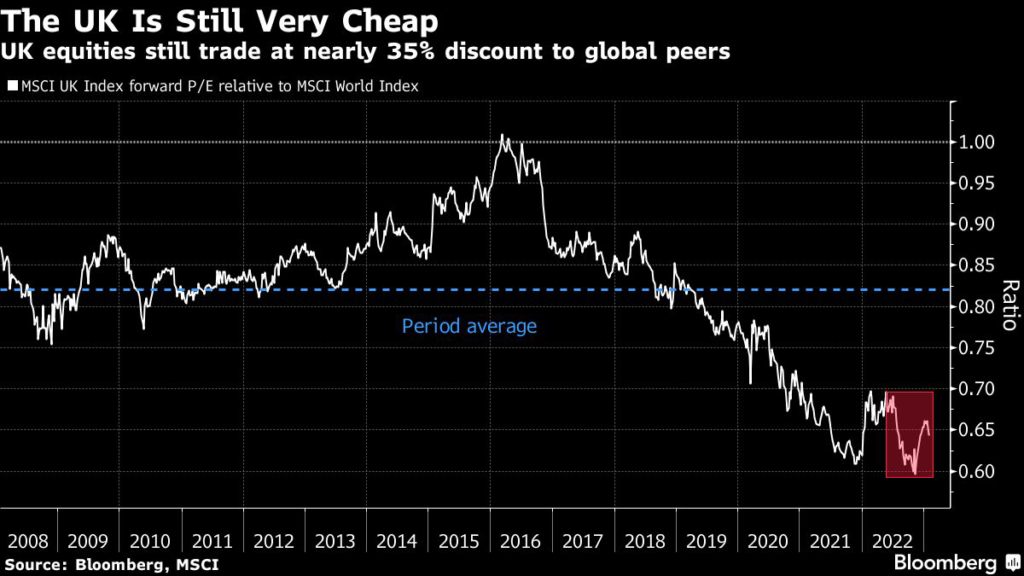 London-listed stocks remain cheap even after outperforming during the past 12 months, with the MSCI UK Index trading near a 35% discount to global peers — well below its 15-year average of 18%.