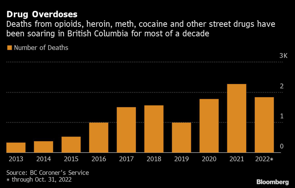 For comparison, overdose deaths in the US were 28.3 per 100,000 in 2020. The province spends billions of dollars annually on services and facilities for drug users as it attempts to cope with its public health emergency.