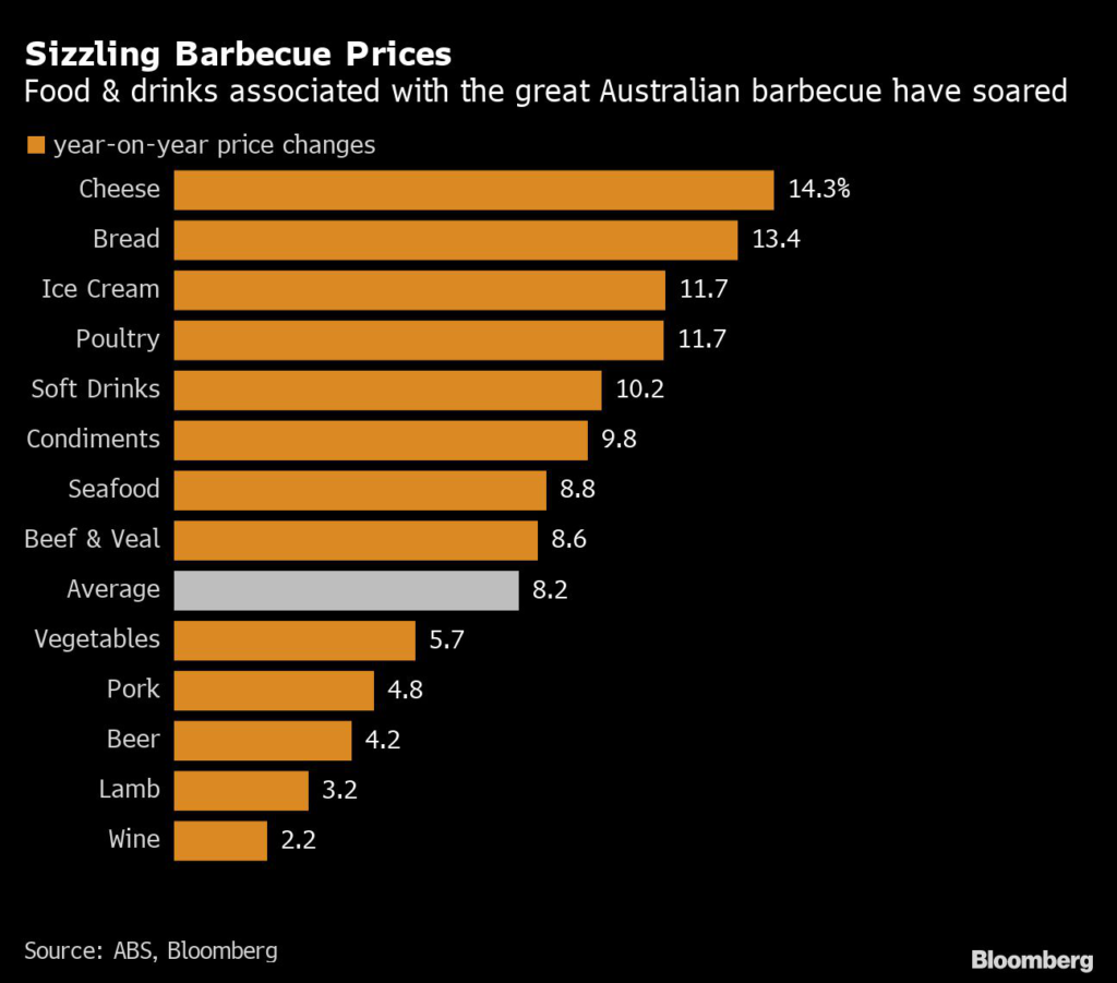 Bloomberg’s Barbecue Index crunches data from the Australian Bureau of Statistics, looking at the prices of key ingredients in the great Aussie barbecue — seafood, beef, lamb, wine, vegetables and cheese.