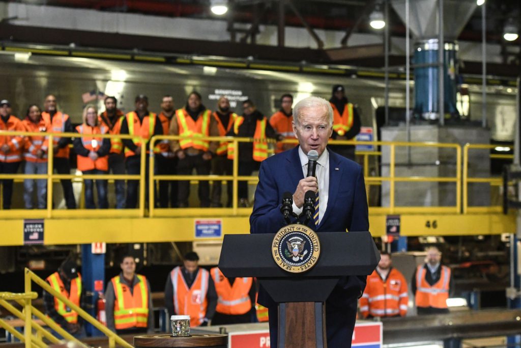 The events allow him to travel outside of Washington and tout his major legislative accomplishments, similar to campaigning. In Baltimore on Monday, Biden spoke from a podium in which he was centered between the American flag and an Amtrak train that blared its horn as he concluded his remarks.