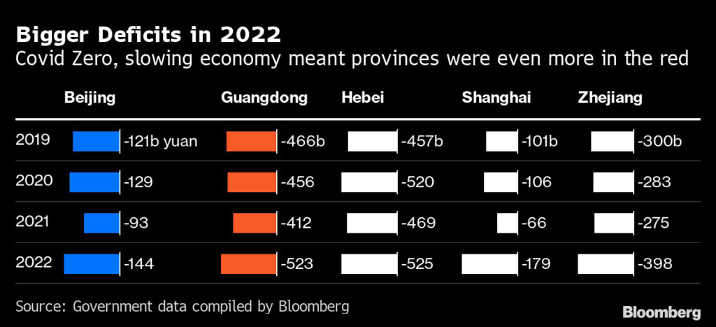 (Bloomberg) — China’s budget deficit jumped to a record $1.3 trillion last year, showing the strain put on local government finances by the spending needed to implement and offset the ultimately futile Covid Zero policy.