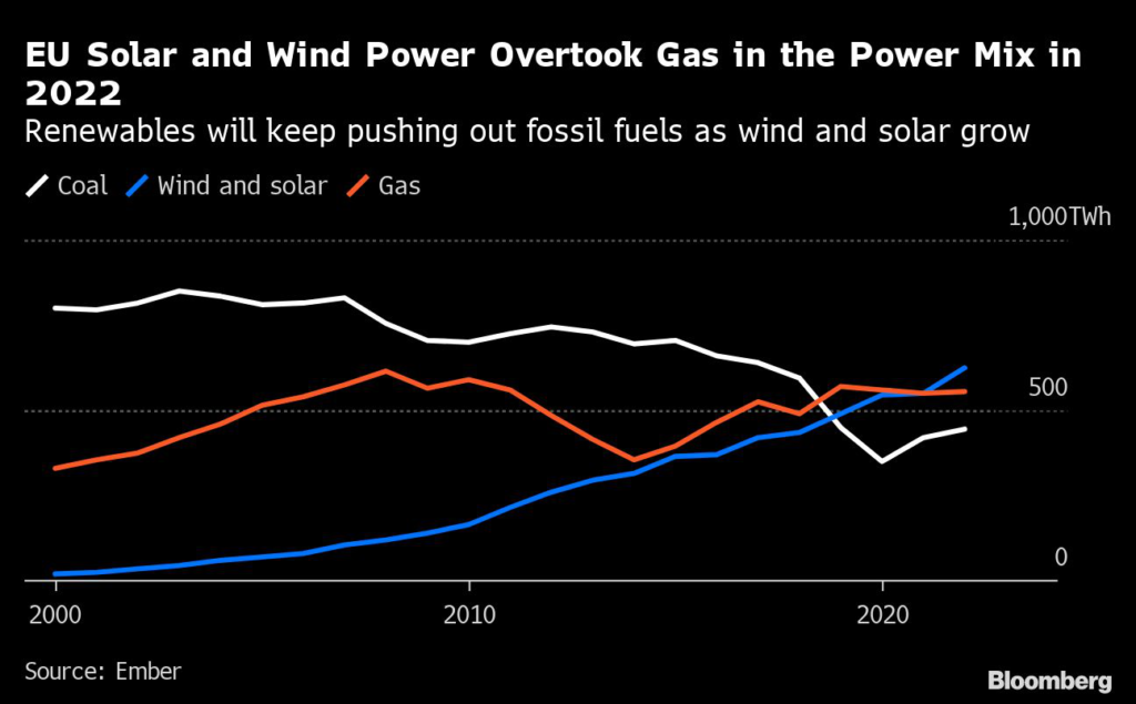 (Bloomberg) — The amount of electricity produced from burning fossil fuels in the European Union is set to plunge this year as the bloc focuses on renewables to replace energy supplies from Russia.