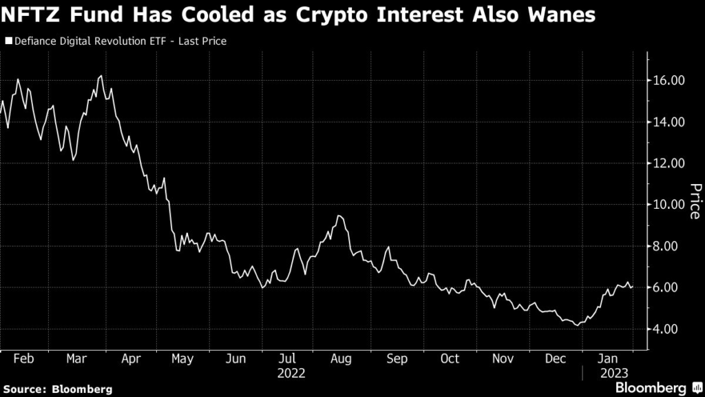 NFTZ, which didn’t invest in cryptocurrencies directly, is closing out January with roughly $5.3 million in assets, compared with nearly $14 million at its height in March 2022, data compiled by Bloomberg show.