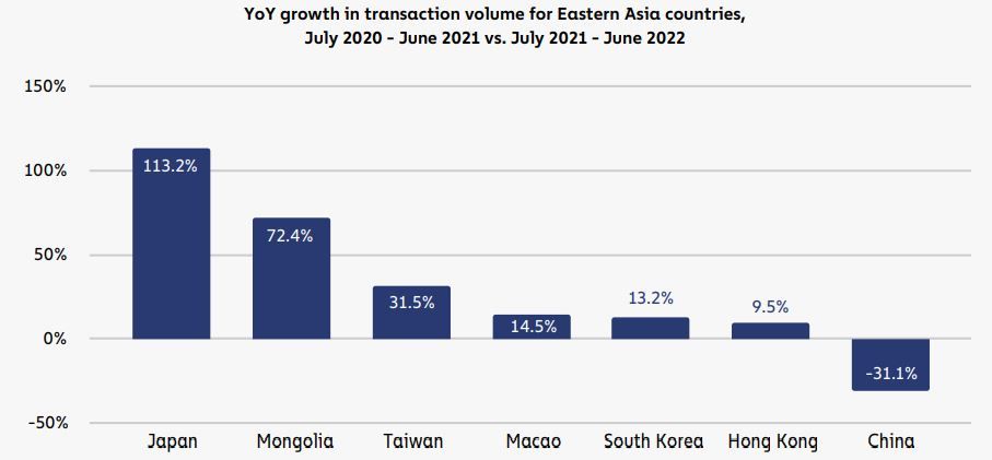 Digital-token transaction volume in Hong Kong expanded less than 10% in the 12 months through June from a year earlier, the least in East Asia outside of a slump in China, according to blockchain specialist Chainalysis Inc.