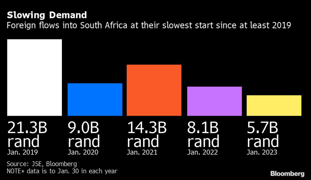 January net inflows of $327 million mark the slowest start for local debt sales since at least 2019, when the Johannesburg Stock Exchange began reporting the data. Foreigners sold $402 million worth of the nation’s debt on Monday alone.