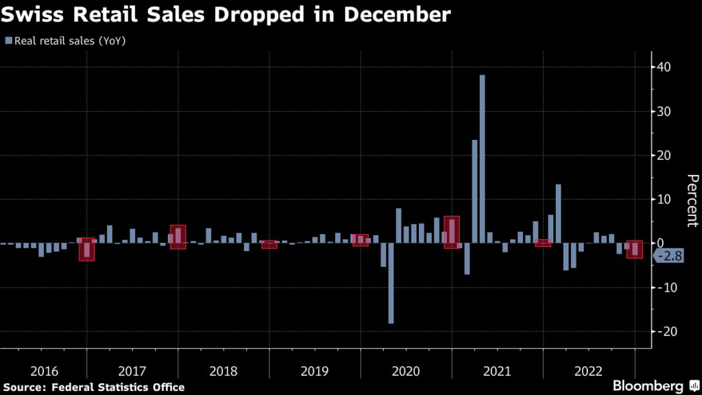 (Bloomberg) — Swiss retail sales fell in December from a year earlier as winter gloom and inflation concerns weighed on consumers.