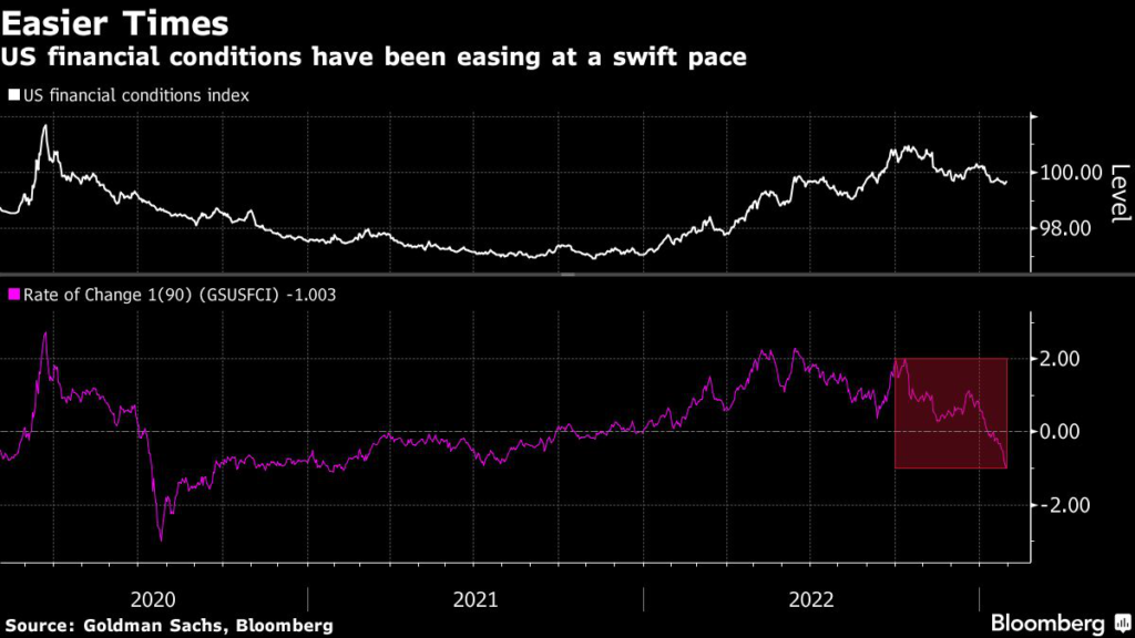 In turn, the cross-asset rally has triggered the fastest easing in financial conditions since global policy makers engineered a market turnaround with historic stimulus to combat the 2020 Covid turmoil.