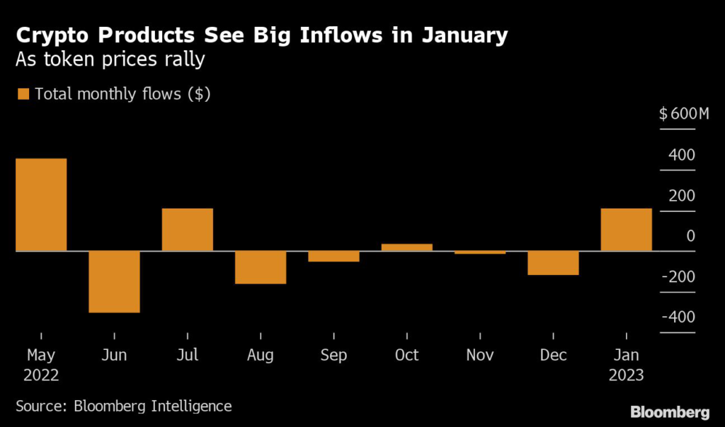 More than $210 million poured into exchange-traded products that track cryptocurrencies in January, the most since May, according to data tracked by Bloomberg Intelligence.