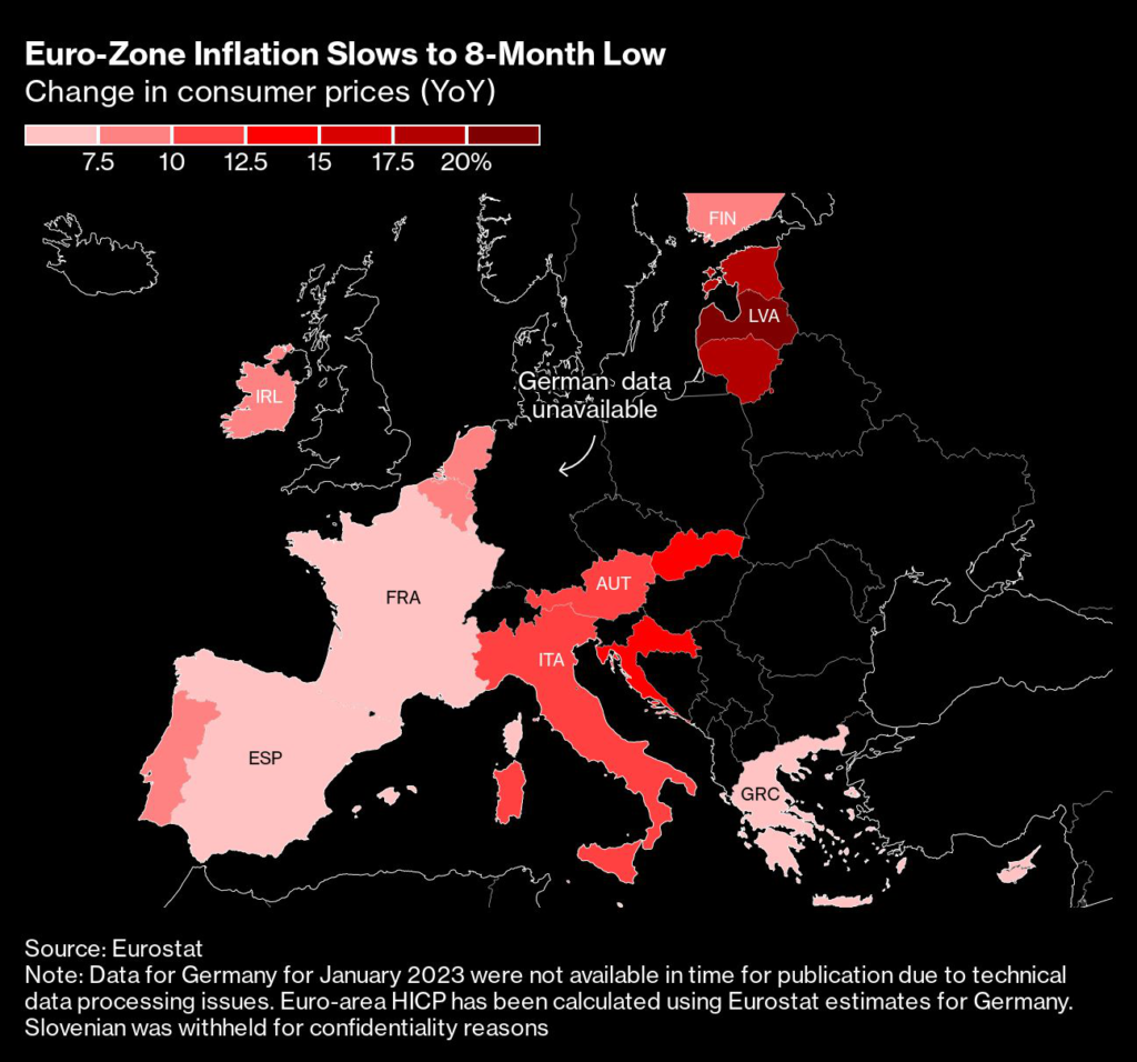 The data may embolden more dovish officials at the ECB who are starting to push for an easing in the pace of rate hikes following a widely anticipated half-point move on Thursday.