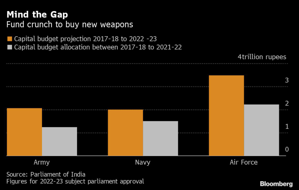 India is among the world’s top five defense spenders but most of the funds go toward paying the salaries for its over 1.4 million-strong military as well as pensions.