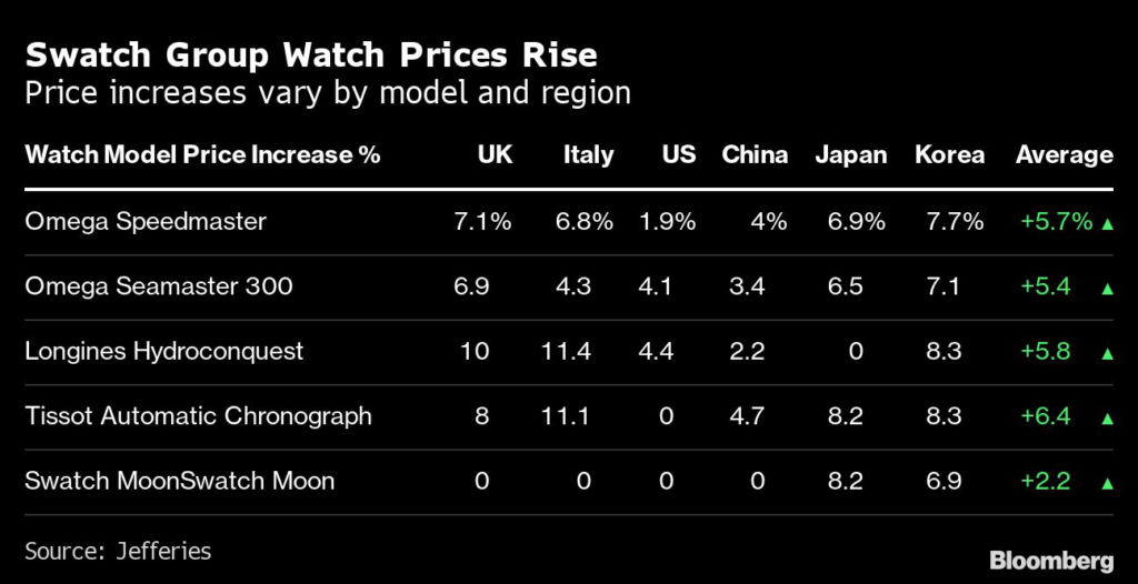 Luxury watch conglomerate Swatch Group AG raised prices across a slew of its brands, increasing the cost of the flagship Omega Speedmaster by about 7% in the UK and Europe, according to investment bank Jefferies.