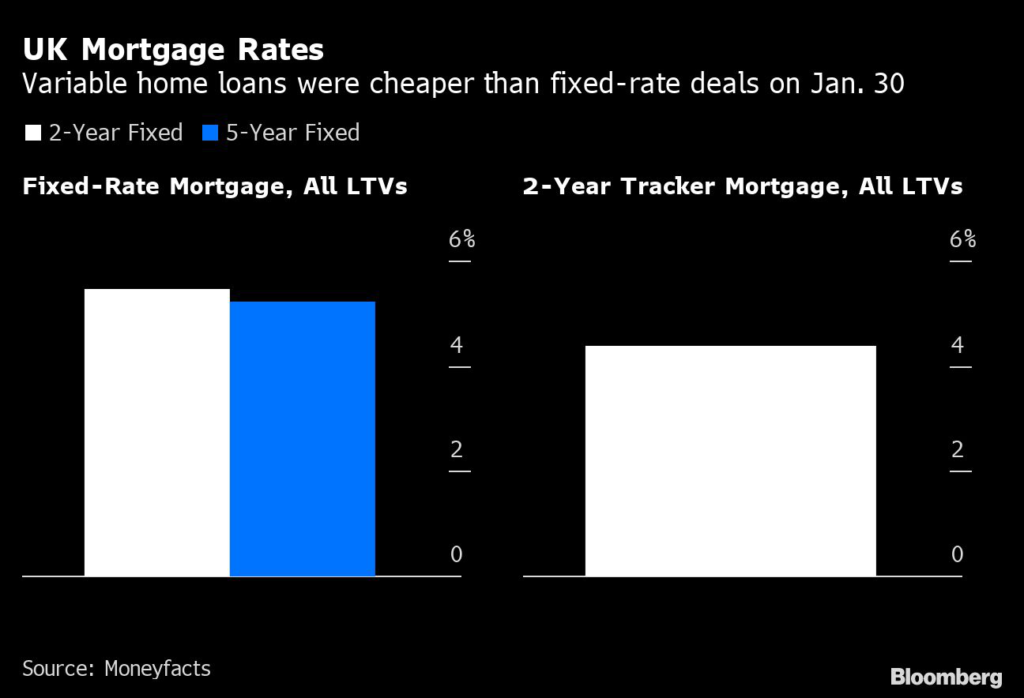 (Bloomberg) — Britons are turning to floating rate mortgages that track the Bank of England’s key lending rate in a bet that policy makers will soon begin to slash borrowing costs.